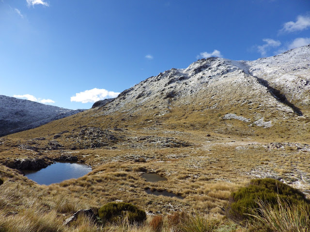 L'avancée à travers ce décors éblouissant est assez laborieuse : le soleil a pas mal tapé sur le col, et le chemin, mélange de gadoue et de neige fondue, est encaissé entre les touffes d'herbes et de hautes mottes de terre, et nous le quittons rapidement pour progresser dans la broussaille et la neige en direction du Kelly. Nous passons la Caroll Hut vers 14h, et une dizaine de minute plus tard, nous voilà sur le col, au bord d'un petit lac complètement gelé. L'endroit est un régal pour les yeux, et nous nous arrêtons pour grignoter un morceau et établir notre itinéraire le long de la crête pour demain.
